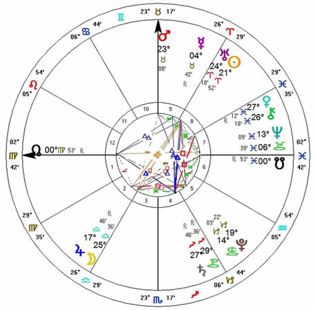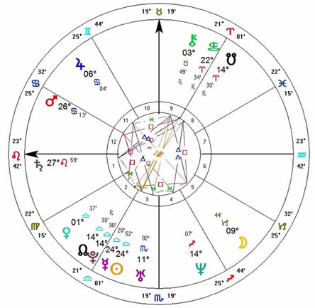The six-pointed ‘Star of David’ pattern is uncommon and usually only approximate, so the exactness of the discovery chart is striking: complementary opposites are balanced in tension but with potential awareness and perfect synchrony, joined by a sequence of sextiles. In some traditions this star is associated with the heart chakra, the 'middle ground' of the seven-fold system: three above and three below the heart, the central pivot of the entire pattern, suggesting the union of Heaven and Earth. Who is this Being, quietly birthed in heart-full amazement to us earthlings and clothed in a breath-takingly beautiful horoscope with such perfect geometry?