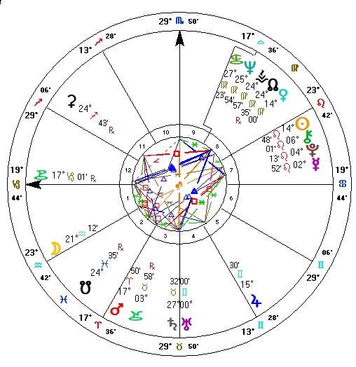 In Chiron’s discovery chart, Saturn in Leo is the fiery ‘odd one out’ of a potential Grand Trine in Earth, moving towards the position of the fixed star Regulus, then at 29°01’ of Leo. In “Brady’s Book of Fixed Stars” we read that each of the four Royal fixed stars brings success, honor and renown, but is also associated with a ‘fatal flaw’ which needs to be overcome, lest it herald our downfall. With Regulus, this potential nemesis is vengeance. Breaking the ‘law of talion’ is an essential inward endeavor during a healing process.