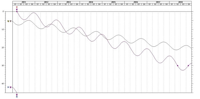 In 2018 (to the right hand side of the diagram), you'll see two blobs on the line representing Uranus. This shows when Uranus moves into the sign of Taurus. As you can see by the proximity of the two wavy lines (Uranus and Pluto) across the page, this marks the ending of the period within which they are moving in and out of being within range of square each other.