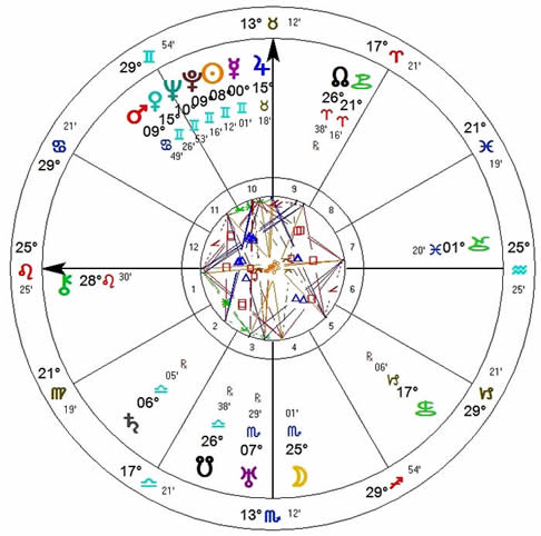 Read here the inspiring story of Harry Edwards, whose chart is below. Note Chiron rising in Leo, trine the Aries Pholus and North Node and conjunct the fixed star Regulus - "Heart of the Lion". His only earth planet is Jupiter in Taurus, conjunct the MC, and he was certainly an earthy and 'larger than life' figure whose presence made a strong impression and easily engaged the large audiences he drew.