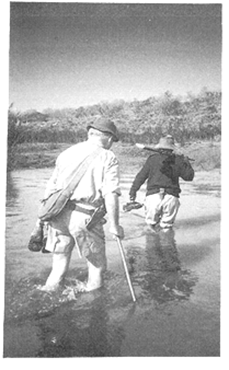 The next morning we made a stew of boerewors (3) and vegetables and lodged the pot in the embers of the fire. “If the baboons don’t get it, there’ll be a delicious dinner when we come home tonight”, said Ian with wry humour. Magqubu began animatedly scraping some burning coals into a circle around the fire. He chuckled and chattered, impersonating a baboon trying to get to the stew, getting his feet burnt, and leaping back with whimpers and shrieks. This hilarious scenario was re-enacted several times with relish, and we were all still laughing as we set off, following the rhino tracks. “We’ll see rhino today”, Ian said with the conviction of one whose intuitive sense has been honed over decades in the bush. We entered an eerie glade of charred and broken trees surrounding a cluster of shallow mud-holes. Rhinos had recently been there, and we were as trespassers in their sanctuary. Out the other side, visibility was limited and my hearing sharpened; the rhythmic brushing sound of us pushing through the tall grass was like music. We scrambled down a steep slope covered in vegetation and then further down to a sandy riverbank below. Preparing to cross the river was a deeply symbolic moment for me, a transition into another dimension of experience.