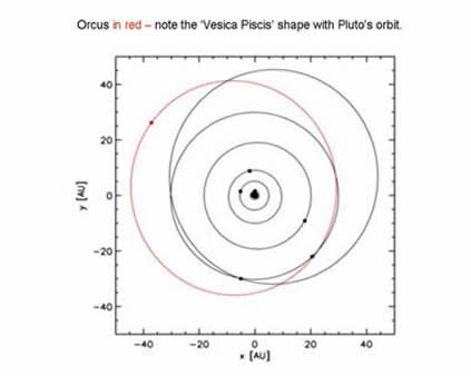 The orbit of Orcus is about the same length as that of Pluto, as is their inclination to the ecliptic. As you can see from the diagram, they both also cross oer the orbit of Neptune. Both are also binary systems with one of their Moons. So it's Pluto-Charon and Orcus-Vanth. Below is a very brief summary of some themes connected with Orcus. Click here for a pdf of notes, including an ephemeris and a list of important oppositions.
