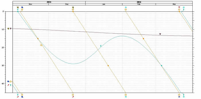 The approach to this Retrograde is characterised by the conjunction of Venus and Pluto (exact November 15th 2013 at 21.33 GMT in 9° 46' Capricorn). You can see on the Graph above the almost horizontal line going across the image, beginning at about number 10 on the vertical 'ruler', left. This line represents Pluto, and you can see that when Venus has retrograded all the way back to her Station Direct (January 31st 2014, 13°33' Capricorn) she is very near Pluto again. This conjunction adds intensity to the Venus cycle, and emphasizes the 'underwordly' dimension of our experience. Processes will go on which are below our threshold of understanding, our capacity for 'trusting the process' might be challenged, we may be made aware of where we have difficulty letting go of past relationship situations, and we are drawn to consider the deepest aspects of our lives.